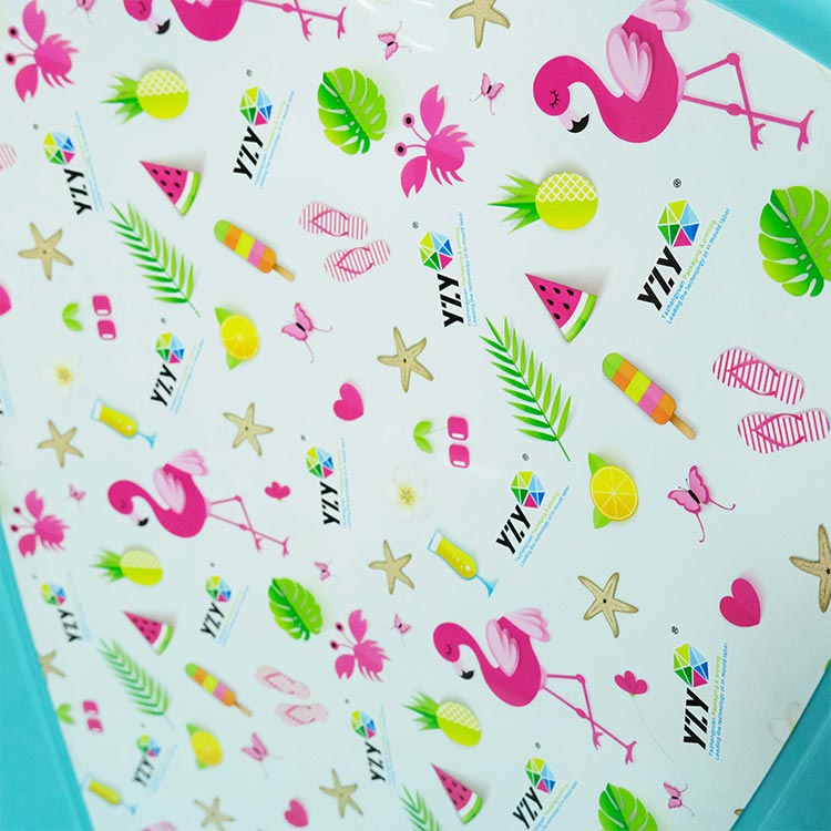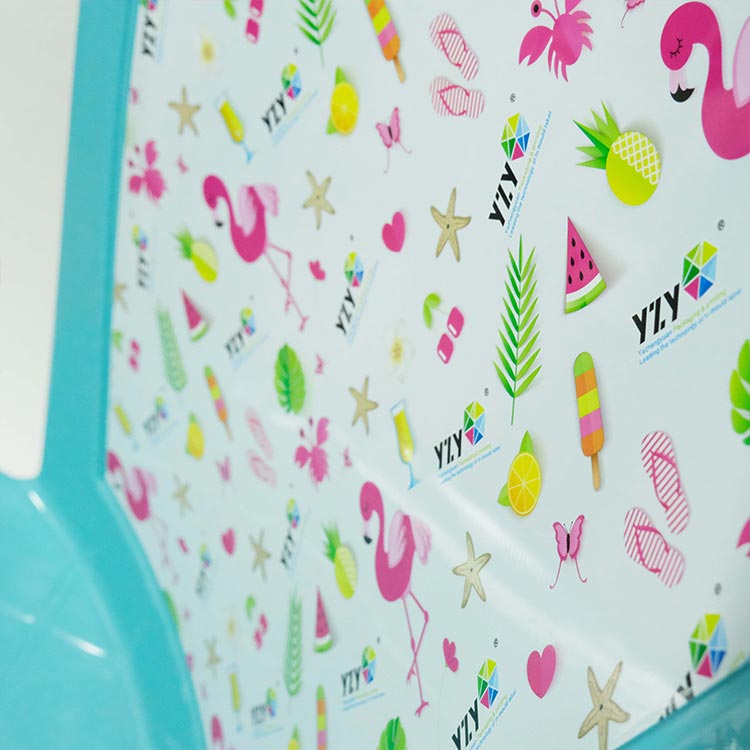 Több megbeszélés és tesztelés után végül az alkatrész-díszítési sémát fogadták el. Az YZY csak a műanyag egymásra rakható szék fröccsöntött formázású címkét alkalmazta a szék háttámlája központi részén, amely nemcsak elkerülte a nagyméretű nyomtatás okozta vizuális fáradtságot, hanem a dekoratív kiemelések révén növelte a vásárló termékének differenciált versenyképességét. A tervezési minták elrendezése megfelelően sűrű és ritka volt, ugyanakkor a megrendelői márka logója és design-mintái is integrálva lettek, megvalósítva a dekoráció és a márkaterjesztés kettős funkcióját. A kis étkészletekhez képest az YZY székek IML címkéi vastagított PET/PP kompozit fóliát használnak, amely egyesíti a szívósságot és a magas hőmérsékletnek való ellenálló képességet, és alkalmas nagy formákban történő nagynyomású öntésre. A szék háttámlája ívelt szerkezetű, és a címkéket 3D-ben kell előre megformázni, hogy illeszkedjenek a forma görbületéhez. Az IML-eljárás a globális termékek mintáinak nagyfokú egységességét érheti el, időjárásálló kialakítással kombinálva, megfelel a tengerentúli piacok követelményeinek.